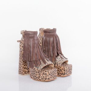 $ 180.000Sandalia ADRYA Animal Print – Cuero vacuno con tachas y flecos desmontables. Taco palo 14 cm y plataforma 5 cm. Doble pulsera y suela de goma. Hecha a mano en Argentina.