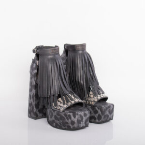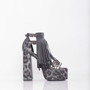 $ 180.000Sandalia ADRYA Black Print – Cuero vacuno con animal print en tonos negros y grises, tachas y flecos desmontables. Taco palo de 14 cm y plataforma de 5 cm. Doble pulsera y suela de goma. Hecha a mano en Argentina.