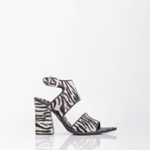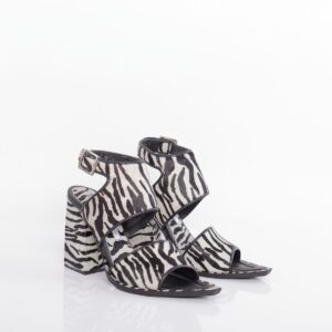 $ 180.000Sandalia VARY Cebra Black – Cuero y pelo vacuno con diseño cruzado y taco de 10 cm. Hecha a mano en Argentina.