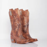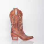 Bota Texana de cuero habano para mujer. Punta cuadrada, suela de cuero, taco ancho con goma antideslizante y forro de cuero. Diseño exclusivo MARRA.