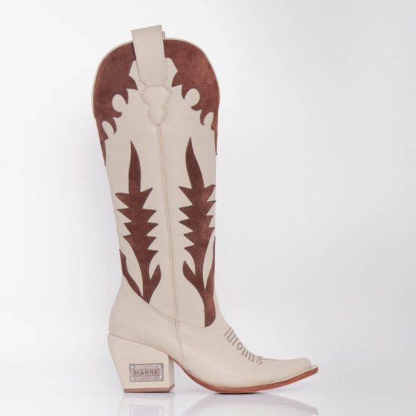 Bota texana de cuero vacuno color beige, combinado con gamuza vacuna color chocolate. Fondo de suela color natural con vira al tono. Taco de 7 cm de alto. Altura total de caña (desde el talón) de 35 cm.
