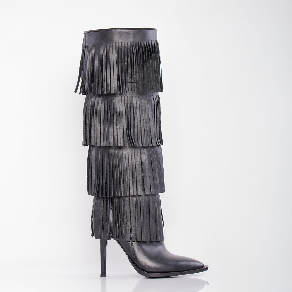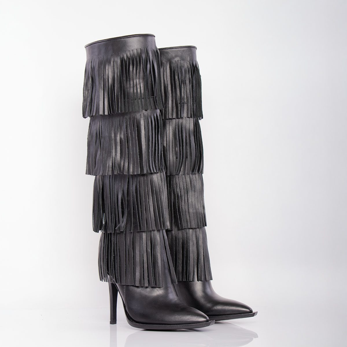 Bota WALA Black – Bota alta de cuero vacuno con flecos y taco de 10 cm. Suela de goma antideslizante. Diseño artesanal hecho a mano en Argentina.