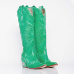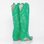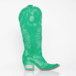 Bota texana de cuero vacuno color verde patinado. Fondo de suela color natural con vira natural. Taco de 7 cm de alto. Altura total de caña (desde el talón) de 35 cm.